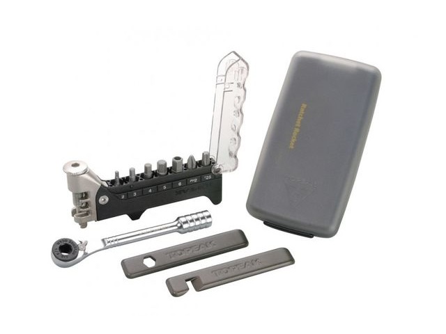 Mini-tool convenience with the speed of a reversing ratchet. The Ratchet Rocket features a fine tooth ratchet mechanism with reverse lever & thumb wheel for quick rotation and control in tight spots. Nine hardened steel bits plus a hollow bit for snapping Shimano chain pins.